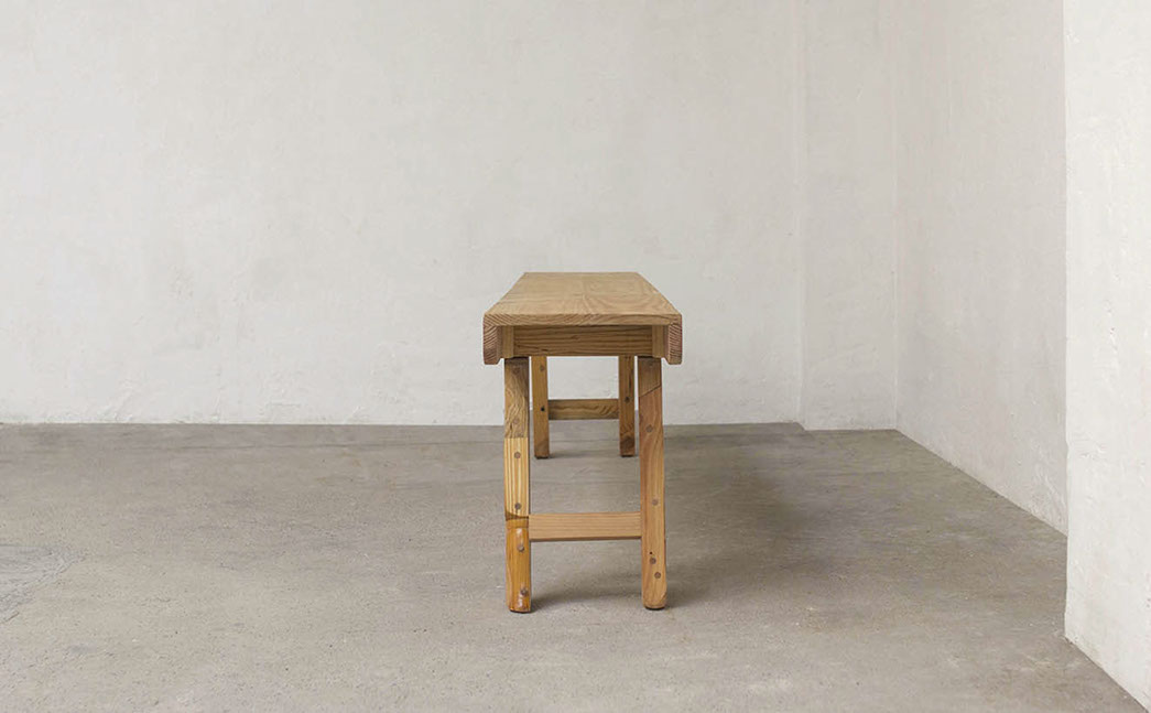 Madera de pino parcialmente reciclada y ensamblada sin tornillería. Acabado con lasur de elaboración propia con materiales naturales.