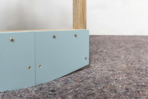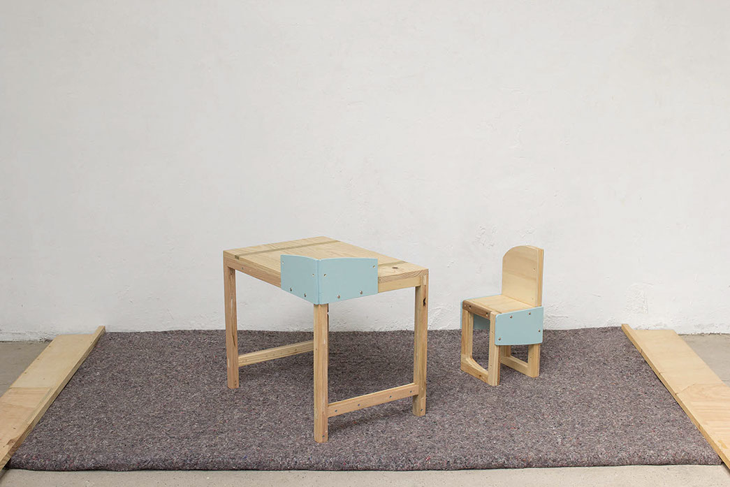 Nosotros le hicimos esta estructura de madera y uniones metálicas que permite 2 opciones de montaje, como cuna balancín o como mesa y silla infantil.